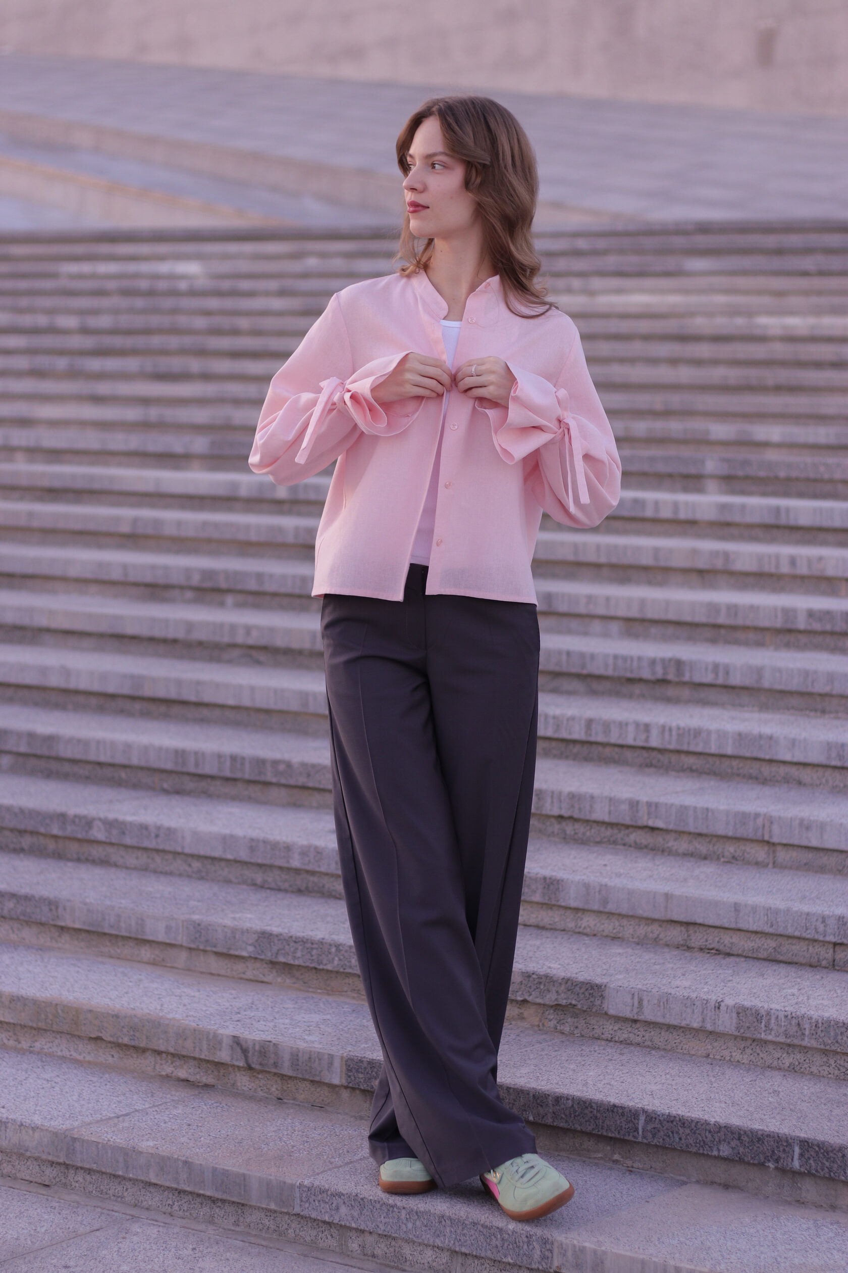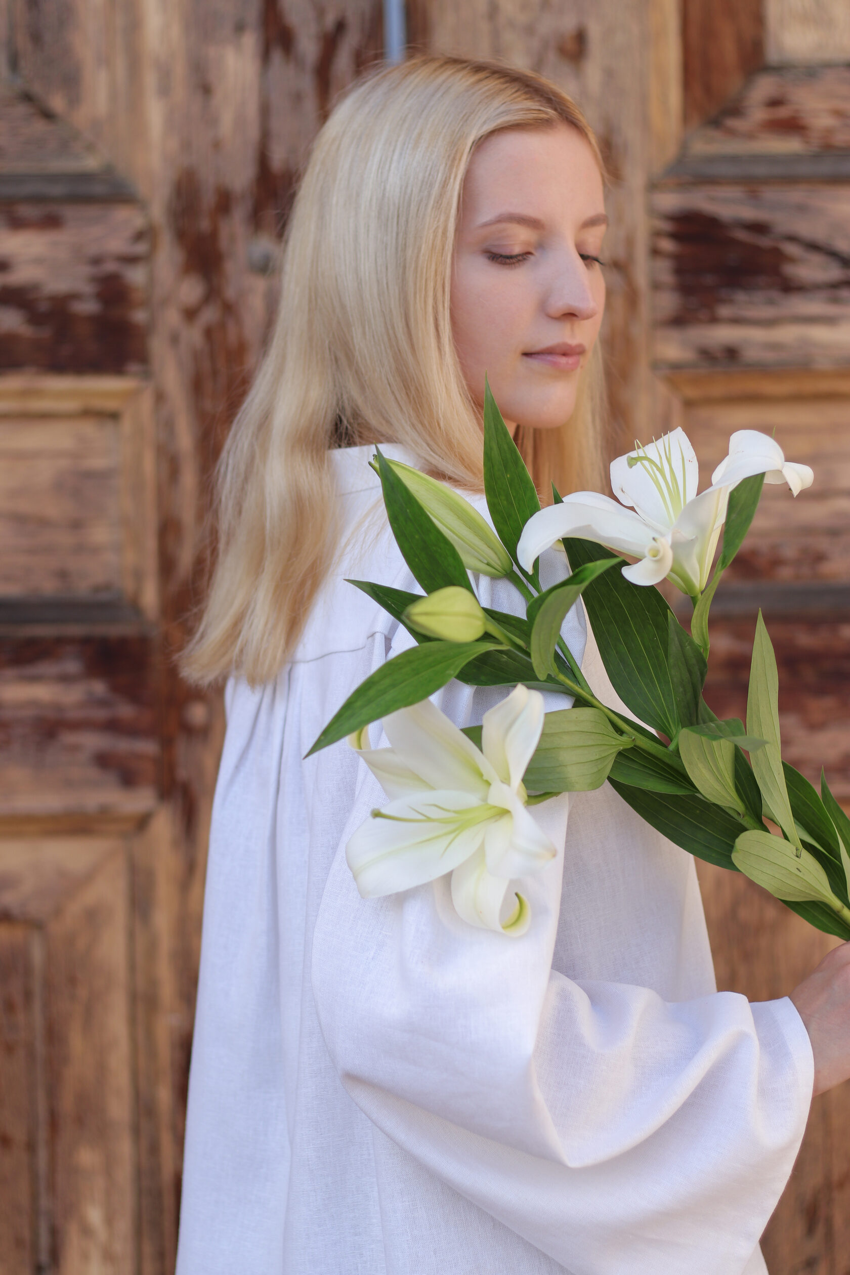 Уход: Льняные вещи стирать в жидком моющем средстве, потому что сухой порошок застревает в волокнах ткани и может их разрушать. Максимальная температура стирки льна марки 30-40 °С.